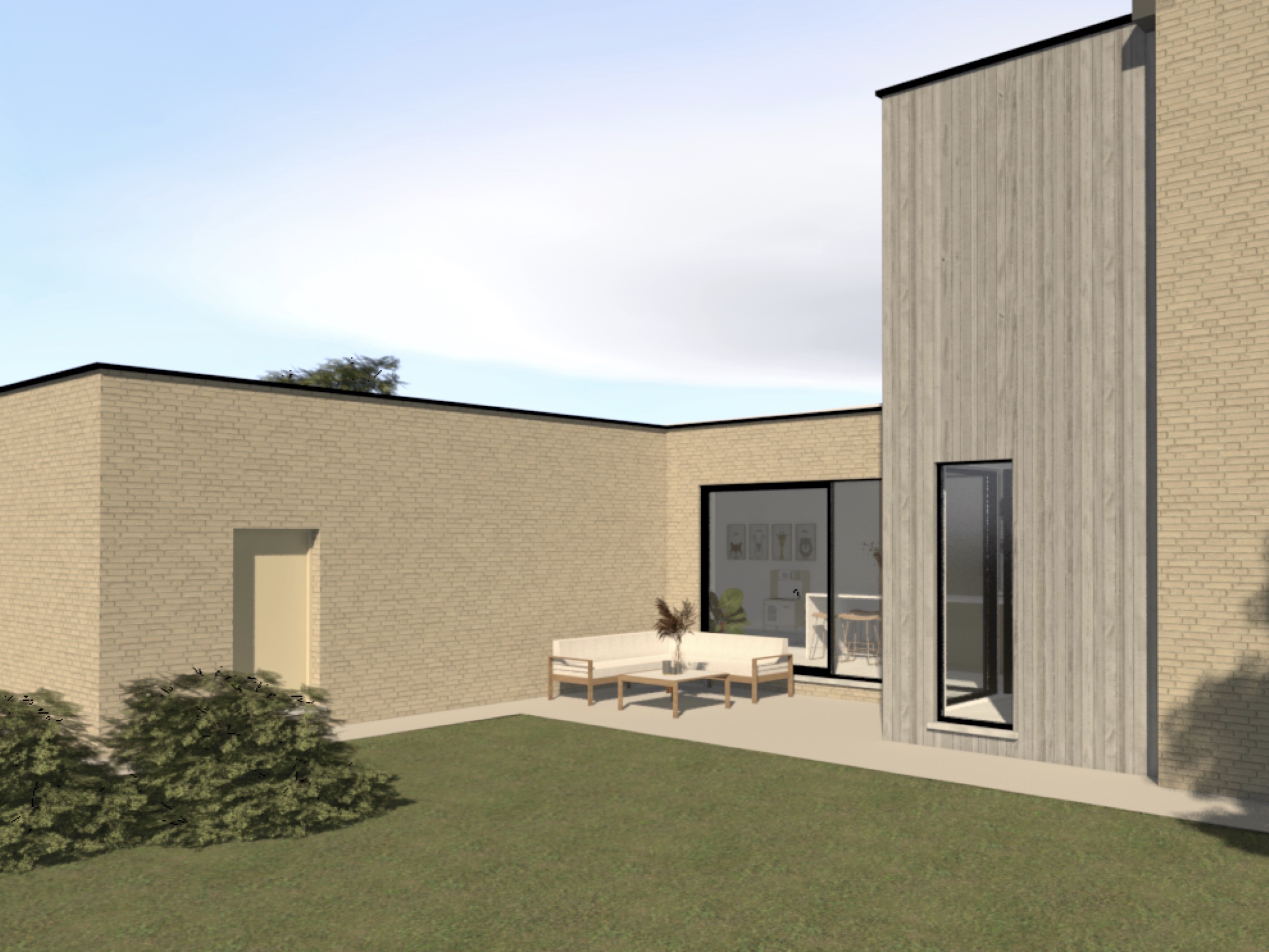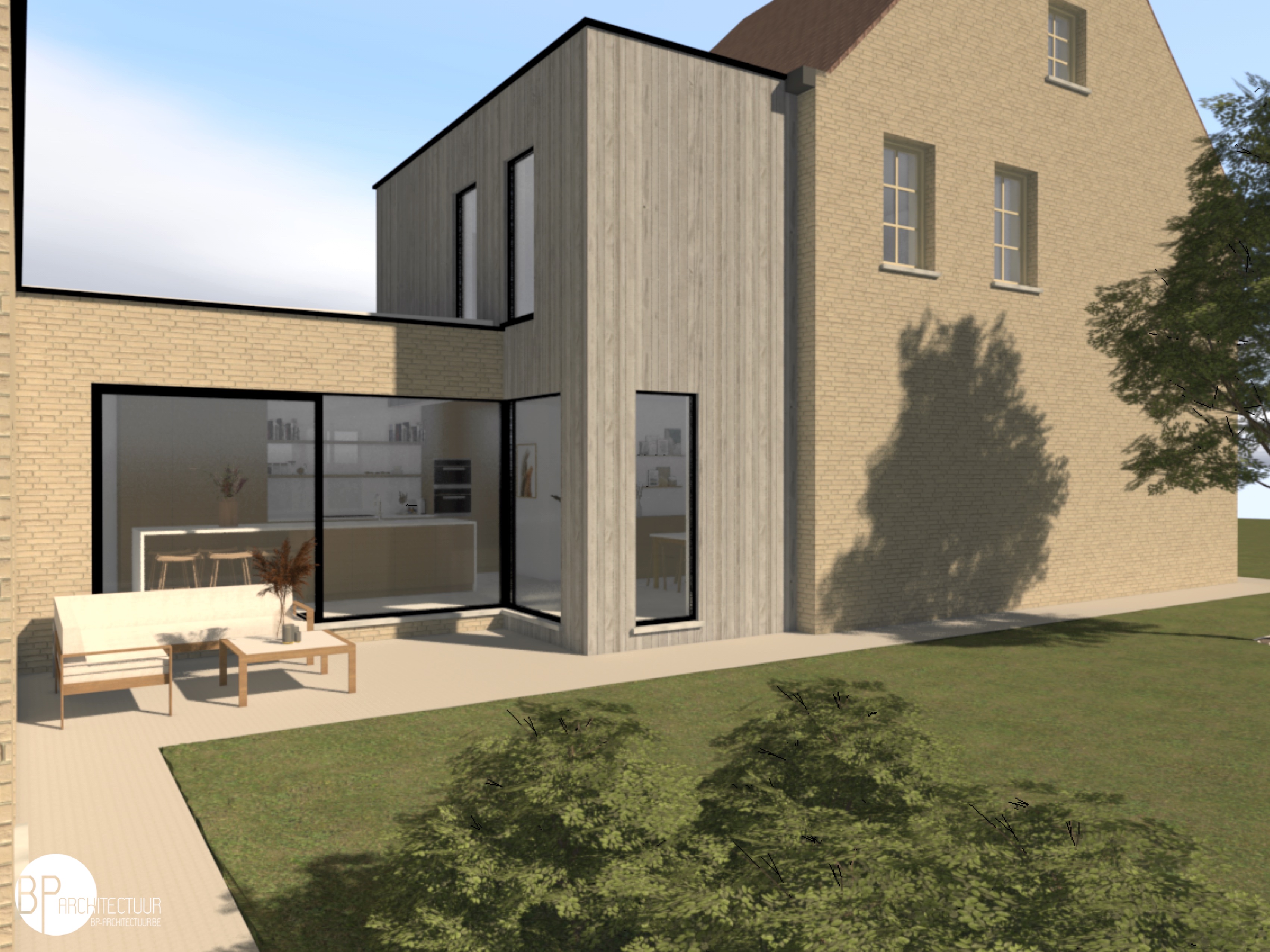De woning wordt volledig geïsoleerd en afgewerkt met steenstrips. De nieuwe uitbreiding op de verdieping wordt afgewerkt met een houten gevelbekleding.